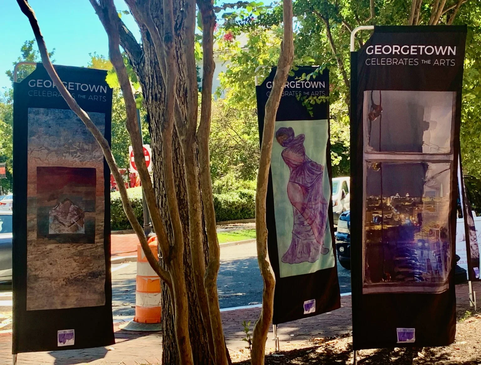 “Twenty-two double sided banners feature artwork by a diverse group of DMV artists. Eighteen are placed on existing street poles and four are installed at the Book Hill Triangle in front of Klagsbrun Studios drawing visitors through the exhibit from both directions.